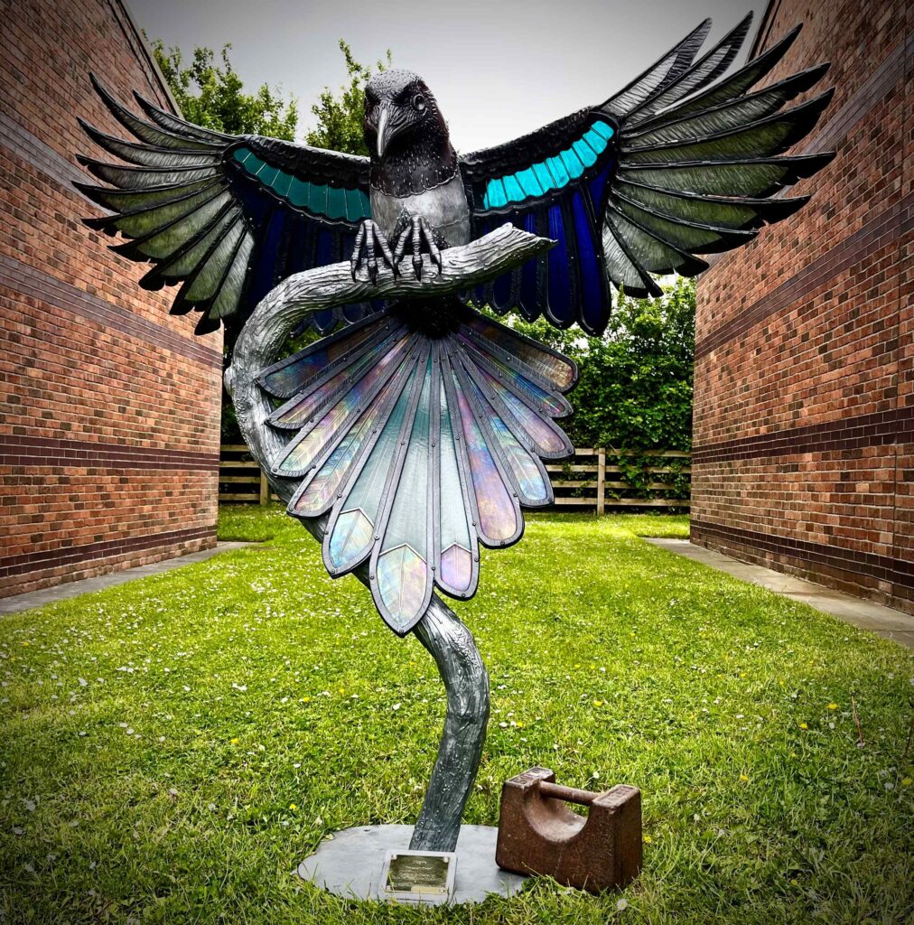 Measuring approximately 1.5metres in height with an equal wingspan, the magpie sculpture combines the timeless craft of stained glass – designed in collaboration with -based Janet Fraser Stained Glass – with the durability of steel. Viewed from a distance, the sculpture’s wings and iconic diamond-shaped tail create an instantly recognisable silhouette, while up close, flashes of colour appear in the glass.